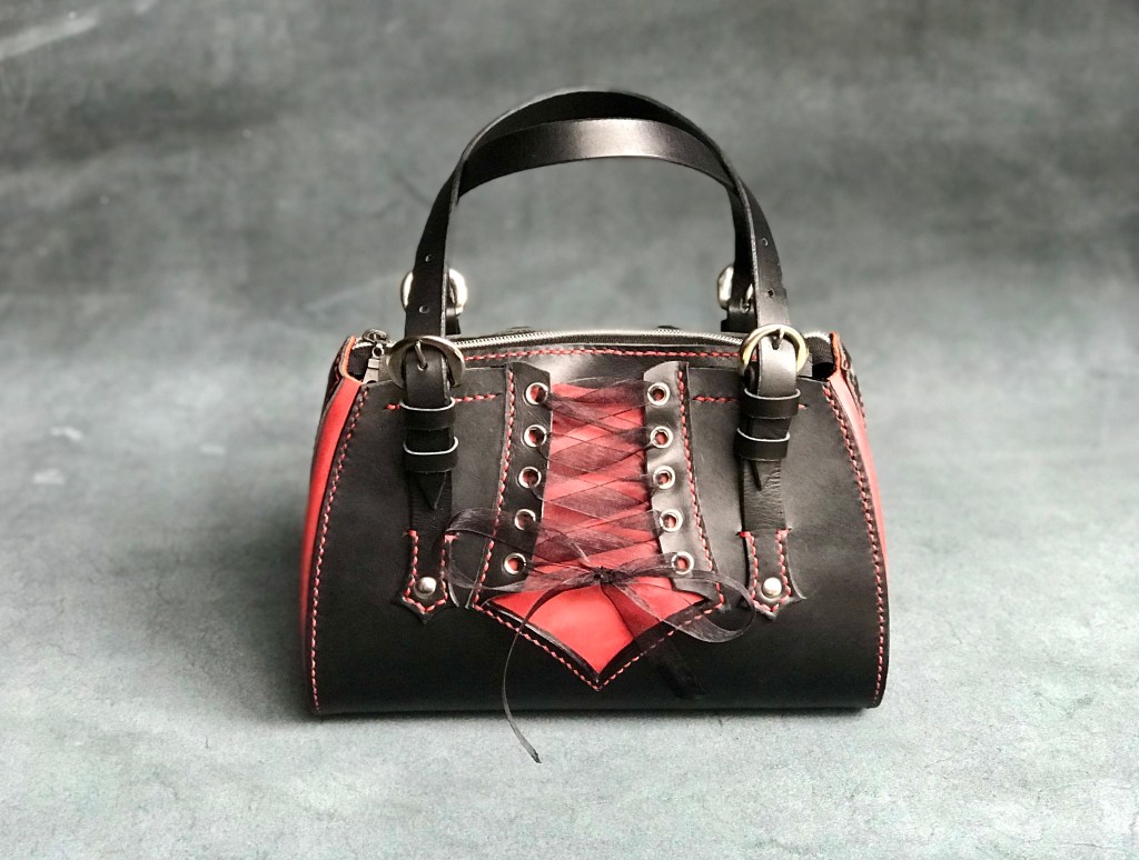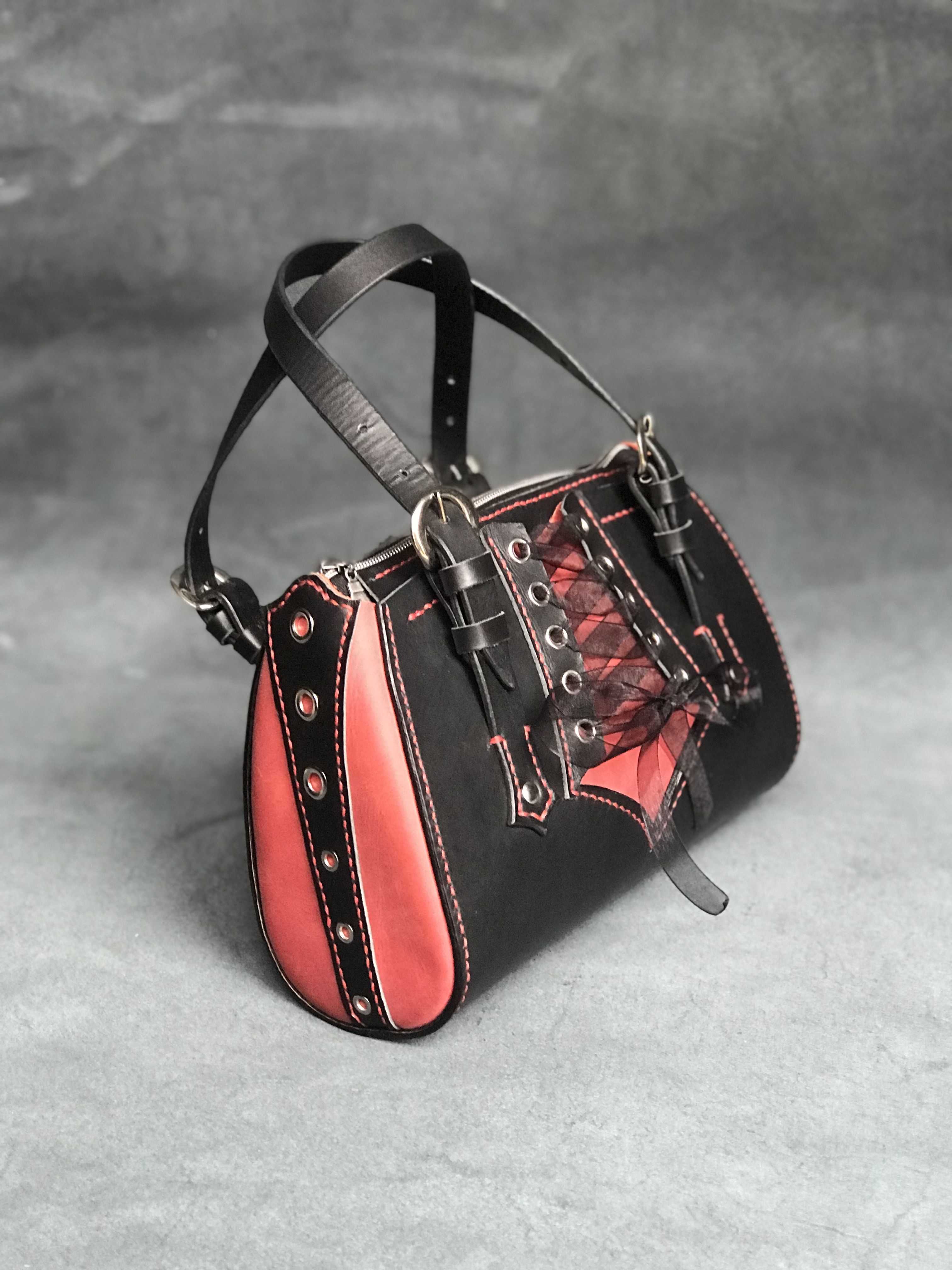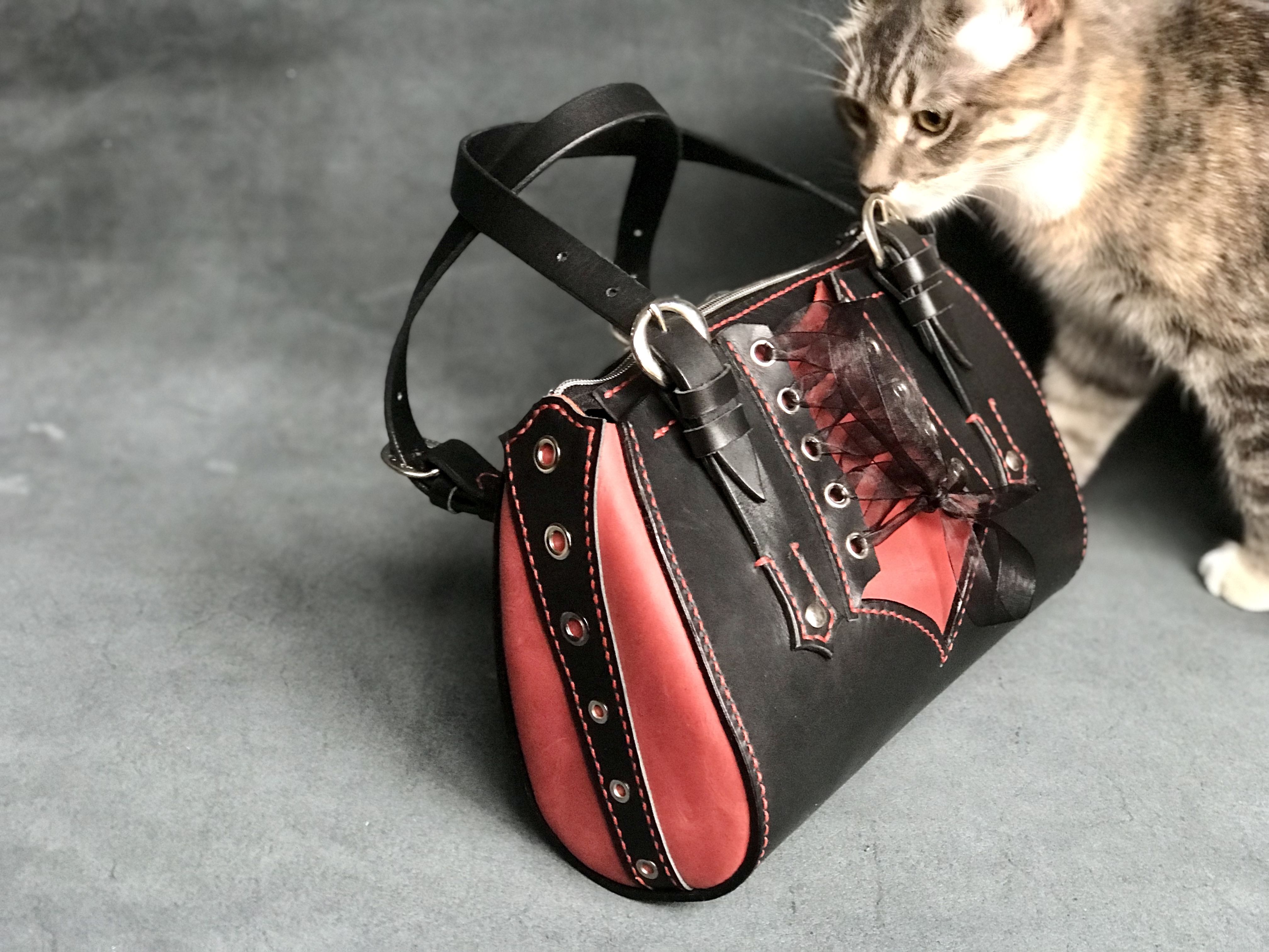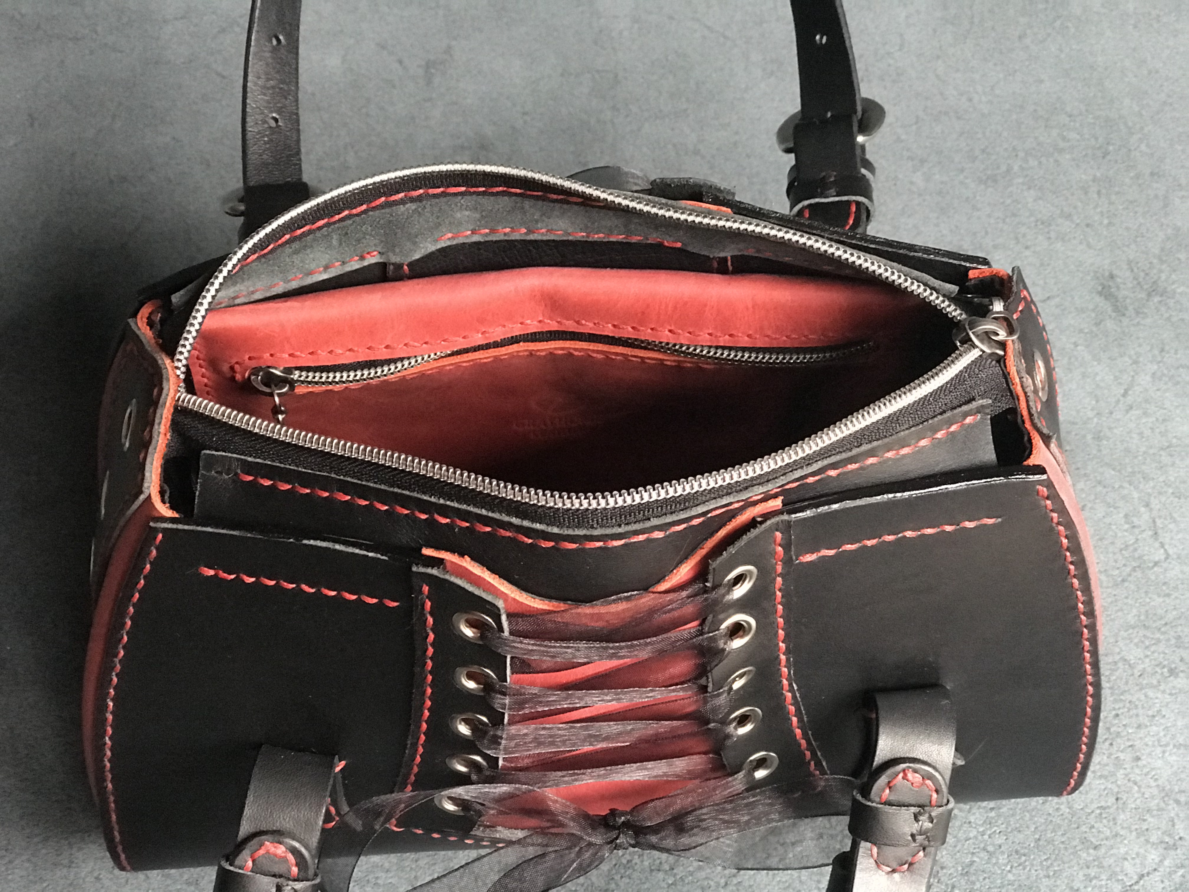 As soon as I saw this pattern, I knew I wanted to make it. Rich black with a soft, velvety red is a classic combo, and the silver and lace accents really hit that party vamp look. The inside features a black leather lining and an inside zip pocket. The original pattern was an open bag, and it really needed the main zipper closure which was worth the extra work. Hand sewn.