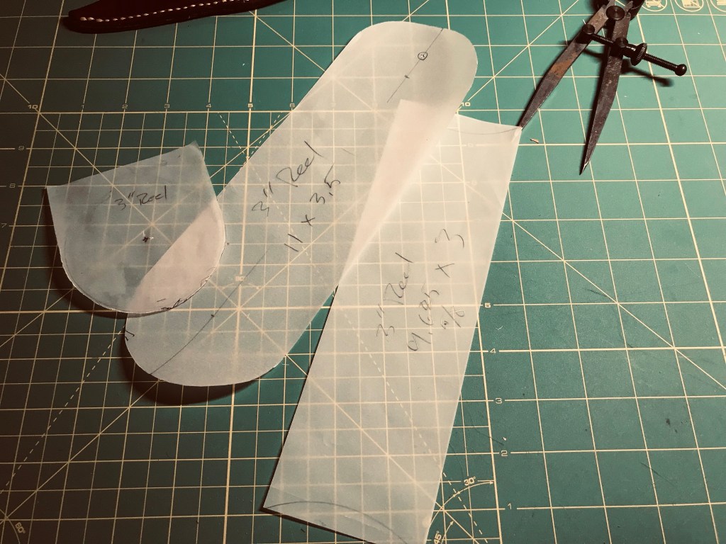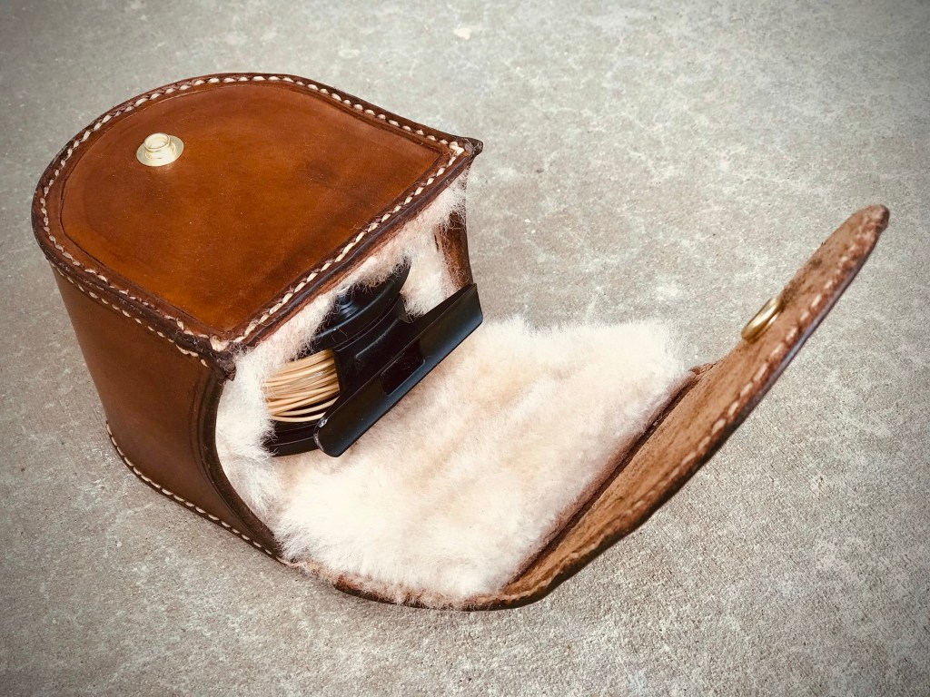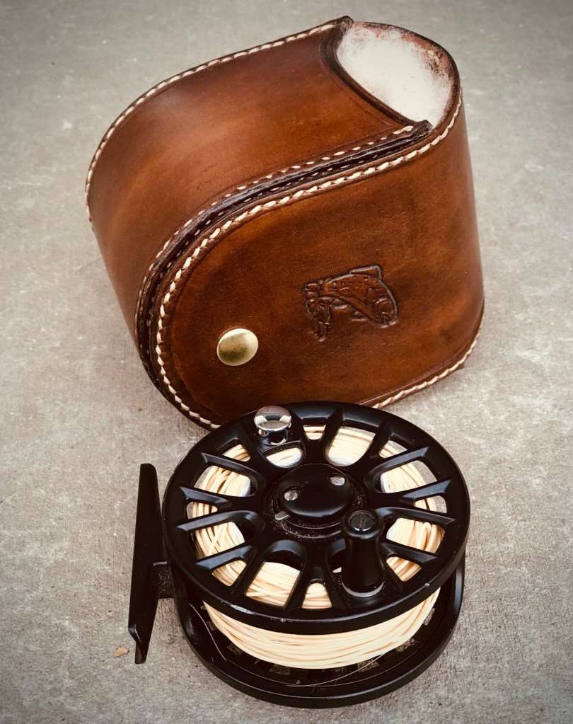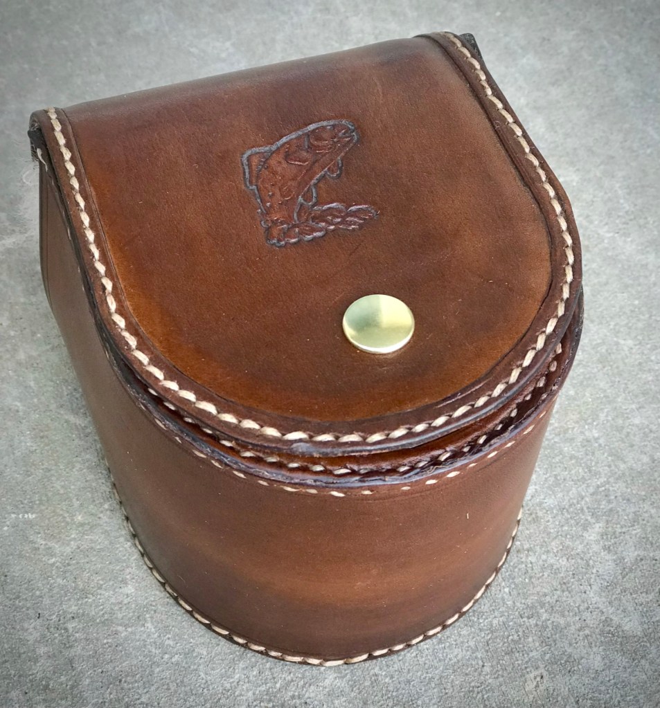 Custom design reel case, made to order for specific reels. With the curves and box-stitch, this was all done in the traditional awl and stitch for every hole.
