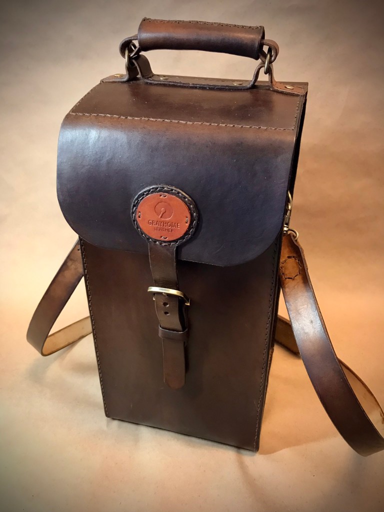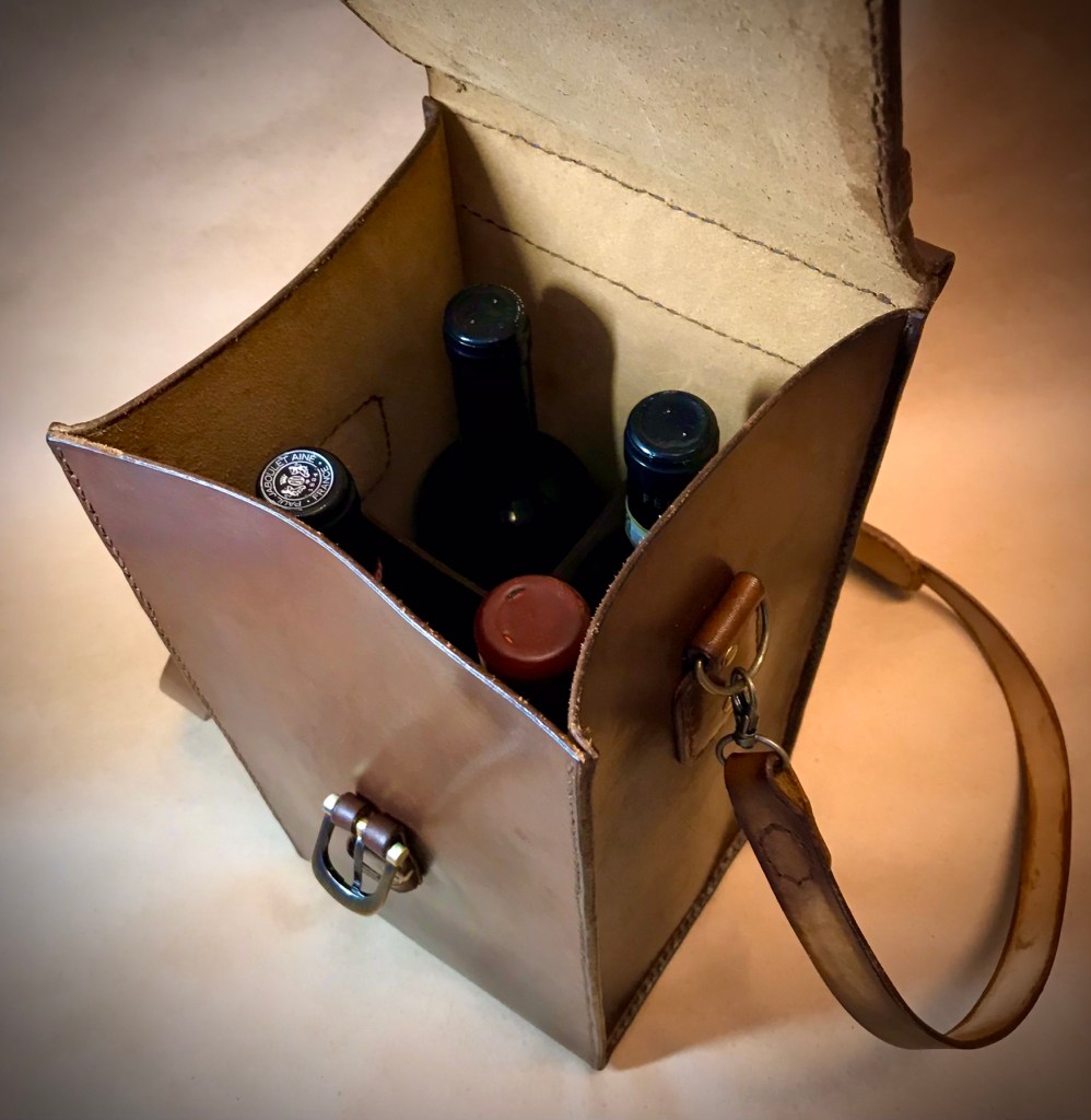Some people carry reusable canvas bags to go shopping. I made a leather wine case to pick up my fine potables.